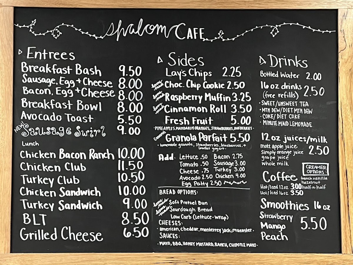 For those with a sweet tooth, Shalom Cafe offers a selection of homemade treats that are simply irresistible. The famous Cinnamon Roll has left diners like Cindy Reddick in awe, saying it was “a whole new level of delicious!!” Complement your meal with a refreshing drink—choose from a variety of 16 oz beverages that include Sweet/Unsweet Tea, flavored coffee options, or indulge in a luxurious White Chocolate and Caramel Latte as Dwight Sauder recommends.